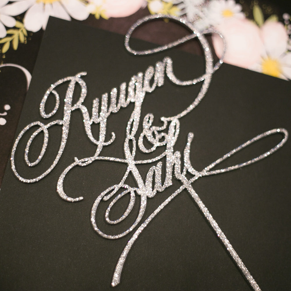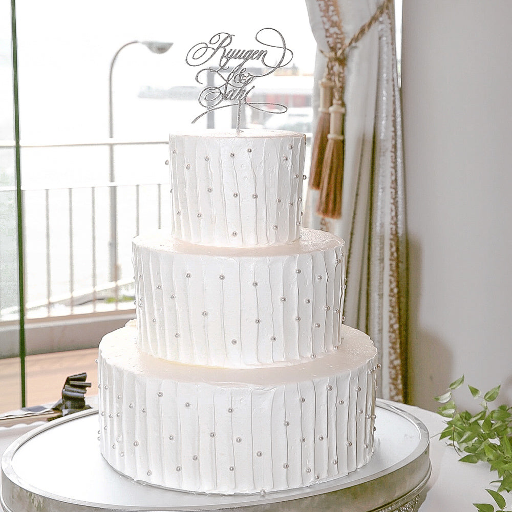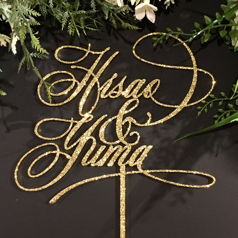 流れるように繊細なラインでおふたりのお名前をケーキトッパーに… 名前の頭文字や終わりの文字からくるりと流れる字形でエレガントな印象です。